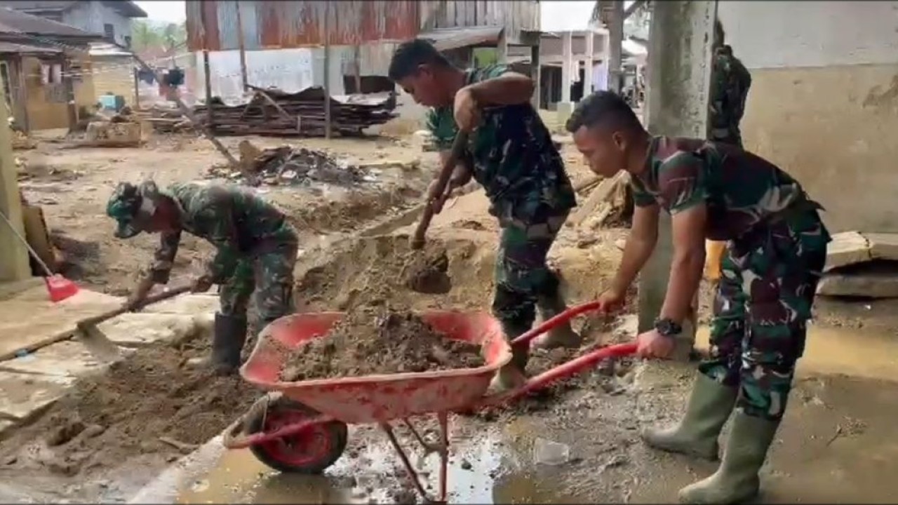 Selain di area pasar, TNI juga melakukan pembersihan aliran sungai dari puing-puing kayu yang terbawa arus dan menumpuk pascabanjir.