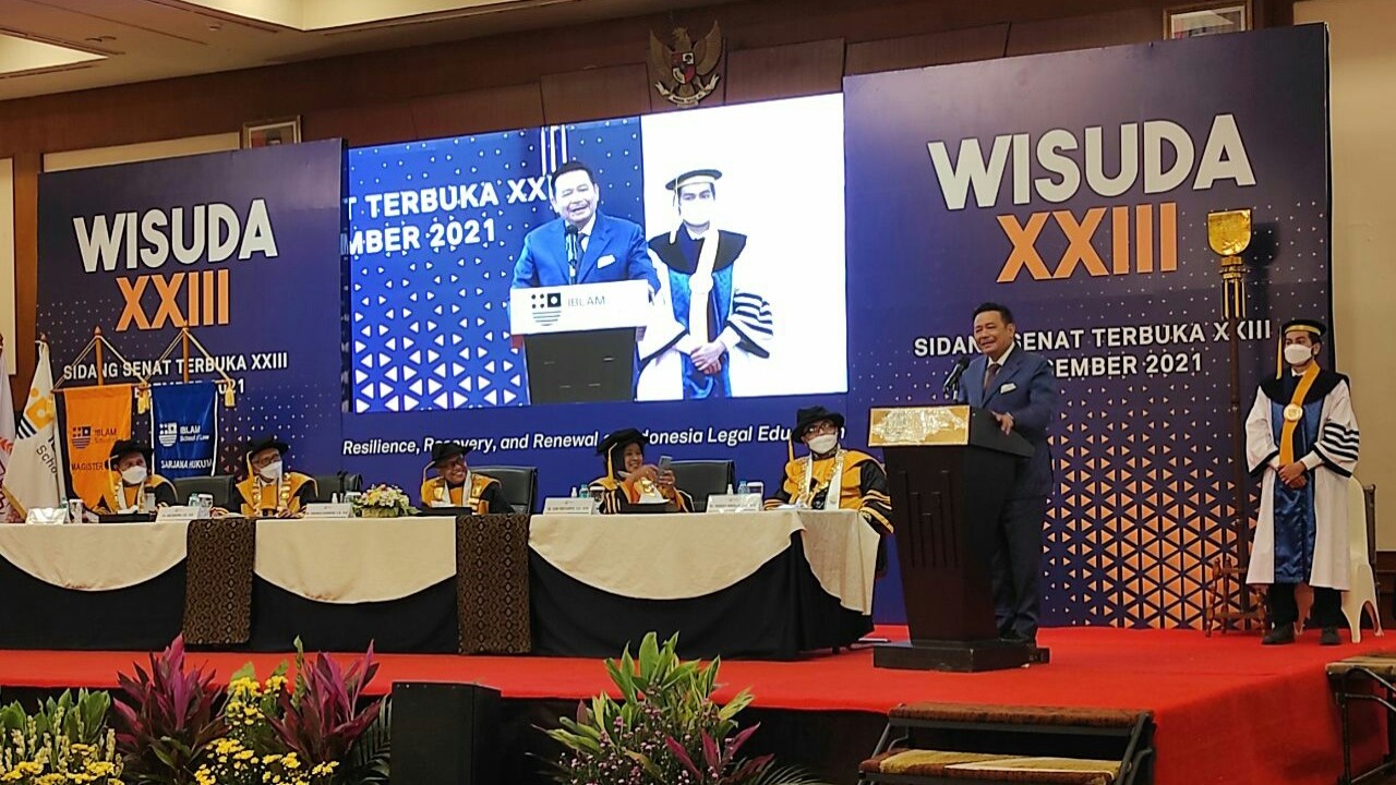 Nusantaratv.com - Praktisi hukum yang juga Ketua Umum Dewan Pimpinan Nasional Perhimpunan Advokat Indonesia (DPN Peradi) Otto Hasibuan, menyampaikan orasi ilmiah dalam Wisuda ke-XXIII Program Sarjana Hukum dan Program Magister Hukum Sekolah Tinggi Ilmu Hukum IBLAM Jakarta, Sabtu (11/12/2021).