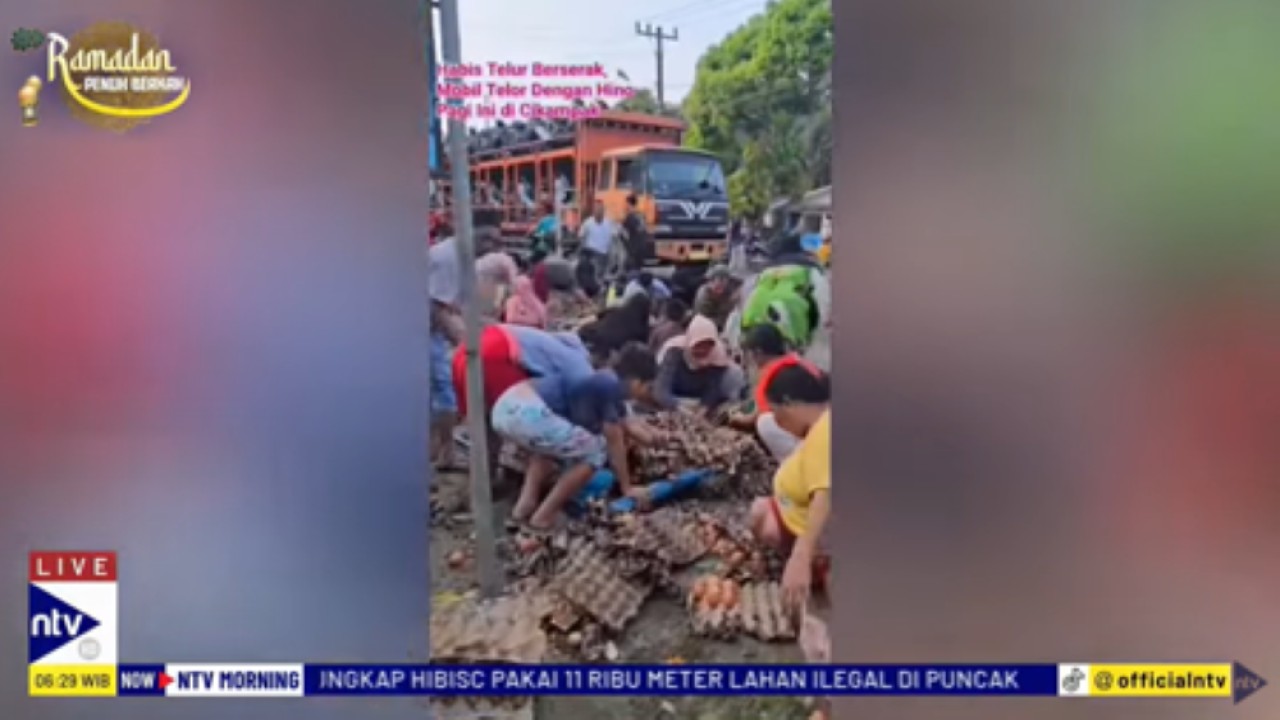 Terlihat warga beramai-ramai mengambil telur yang berserak di tepi jalan.