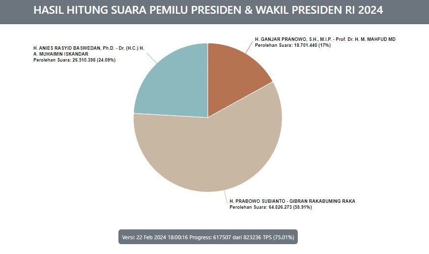 Saat ini, proses penghitungan suara pemilu Presiden dan Wakil Presiden RI telah mencapai 75,01% dari total 617.507 TPS dari 823.236 TPS yang ada.
