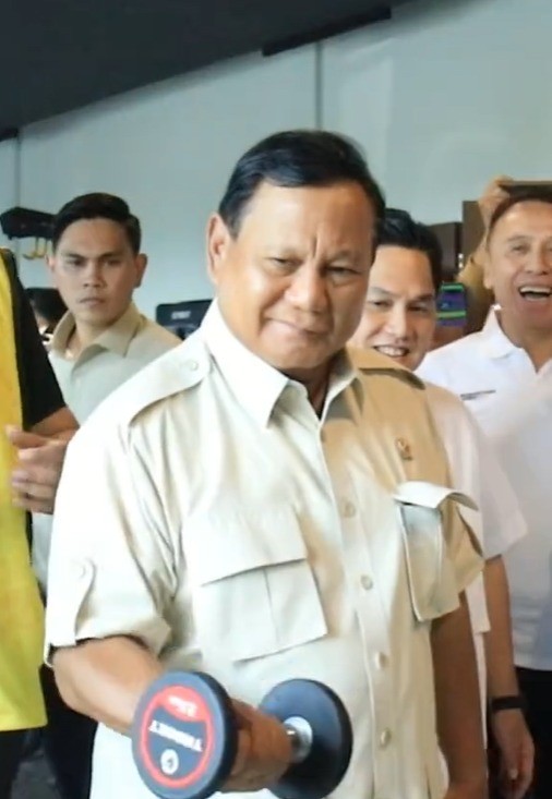 Dalam video tersebut, Prabowo terlihat dengan penuh semangat mengangkat 2 beban lateral raise masing-masing seberat 7,5 kg atau 15 Kg.