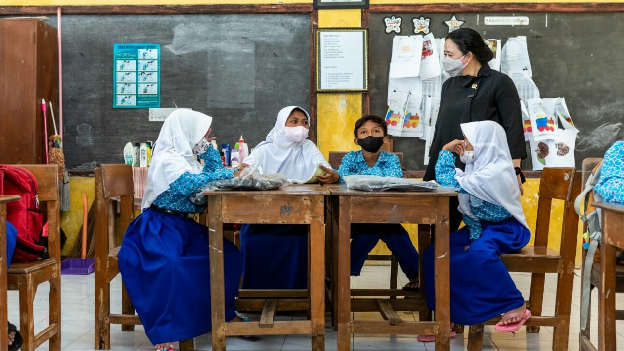 Seorang siswa kelas 3 SDN 1 Sidomulyo bernama Dion mengungkapkan kegelisahannya kepada Puan karena tidak bisa bersekolah.