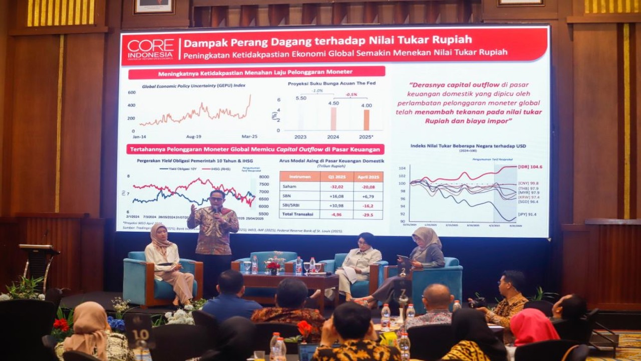 Dalam sesi diskusi, Direktur Eksekutif CORE Indonesia, Mohammad Faisal, Ph.D., mengungkapkan bahwa Indonesia menghadapi risiko serius akibat perang dagang AS-Tiongkok, dengan data menunjukkan penurunan ekspor China ke AS hingga 10,5% pada 2025, sementara ekspor ke ASEAN meningkat hingga 19,1%.
