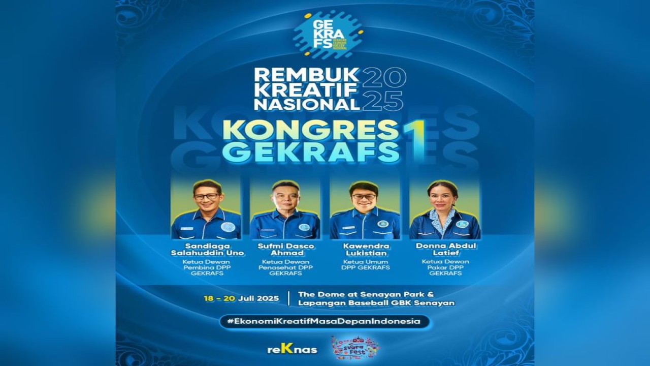 Nusantaratv.com-Kongres I Gerakan Ekonomi Kreatif Nasional (Gekrafs) siap digelar pada 18–20 Juli 2025 di Dome Senayan Park, Jakarta. Pelaksanaan Kongres I Gekrafs, yang merupakan bagian dari rangkaian besar Rembuk Kreatif Nasional (reKNas) 2025 yakni ruang strategis untuk merumuskan arah masa depan Gekrafs sekaligus memperkuat posisi ekonomi kreatif sebagai pilar utama pembangunan nasional.