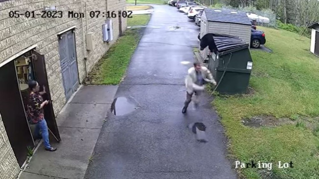 Marsh dan karyawan lain yang keluar dari pintu tepat saat beruang itu muncul, terlihat berlari menyelamatkan diri ke arah yang berlawanan.