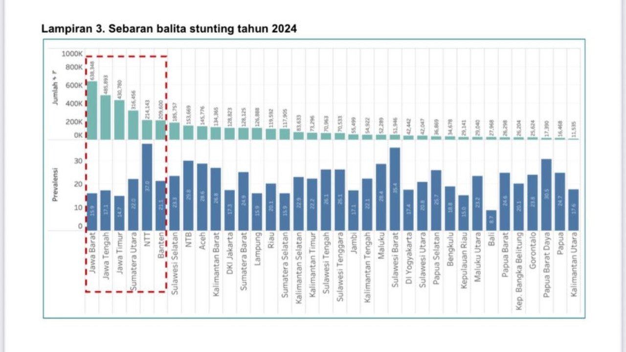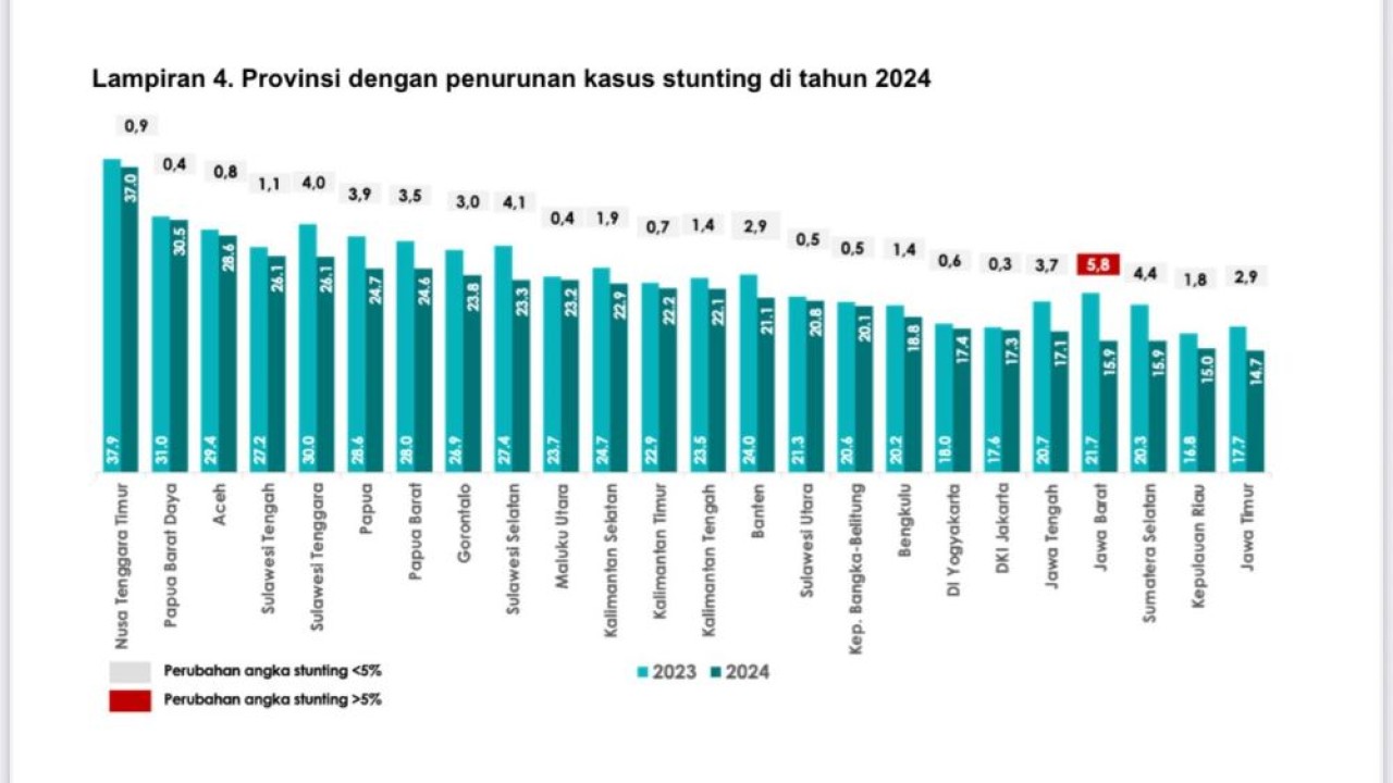Penurunan stunting tahun 2024 paling besar dikontribusikan oleh Provinsi Jawa Barat yang turunnya lebih dari 5%. Cukup besar dampaknya ke penurunan angka stunting nasional.