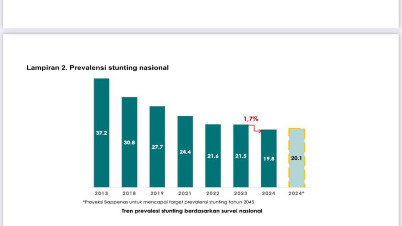 Berdasarkan hasil survei Survei Sistem Surveillance Gizi Indonesia (SSGI) yang diumumkan hari ini, Senin (26/5/2025) angka stunting Indonesia turun dari 21,5% di 2023 menjadi 19,8% di tahun 2024.