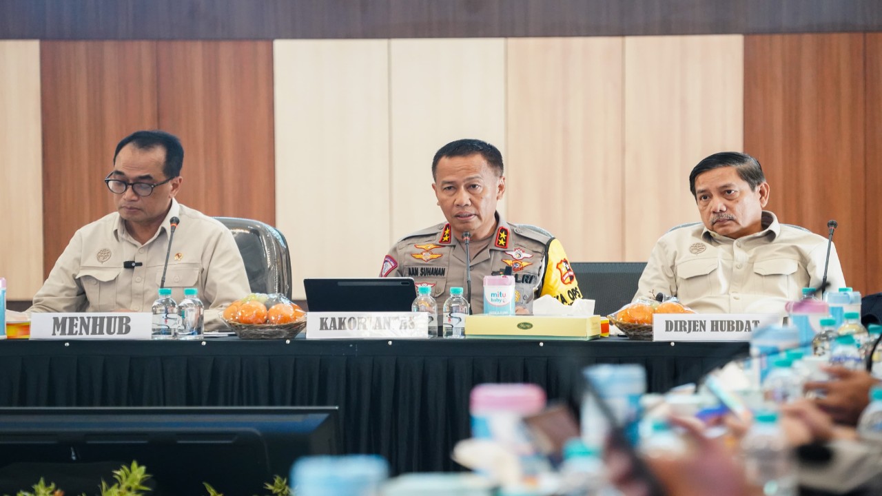 Nusantaratv.com - Kakorlantas Porli Irjen Pol Aan Suhanan bersama Menko PMK Muhadjir Effendy, Menhub Budi Karya Sumadi dan Dirjen Hubdat Hendro Sugiatno melaksanakan Rapat Koordinasi Dalam Rangka Pengamanan Arus Balik Idul Fitri 1445 H, di Gedung Serba Guna Polda Lampung, Jumat (12/4).