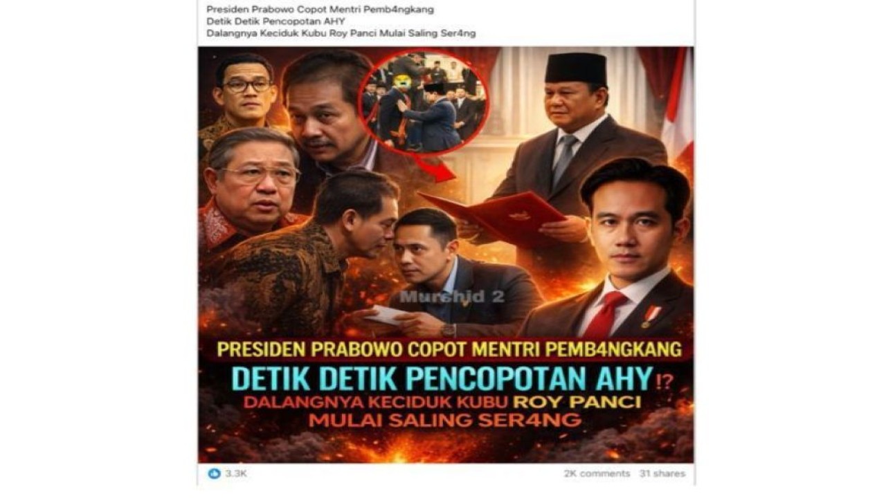 Nusantaratv.com - Sebuah unggahan di Facebook beredar dengan klaim Presiden Prabowo Subianto mencopot Menteri Koordinator Bidang Infrastruktur dan Pembangunan Kewilayahan (Menko IPK), Agus Harimurti Yudhoyono (AHY).