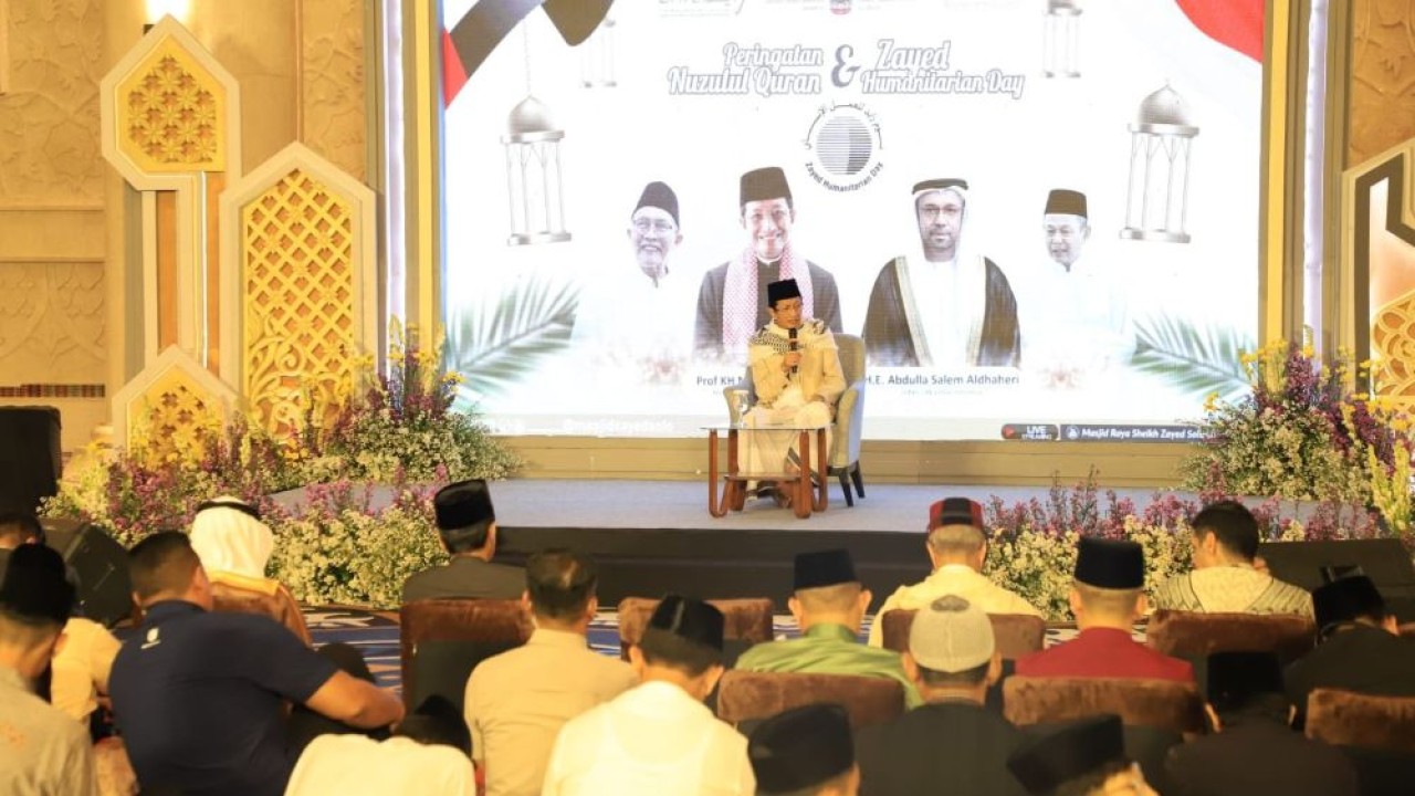 Nusantaratv.com - Menteri Agama (Menag) Nasaruddin Umar menghadiri peringatan Nuzulul Qur'an di Masjid Raya Sheikh Zayed Solo, sekaligus memberikan tausyiyah.