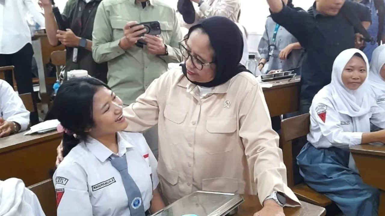 Wakil Kepala BGN Nanik Sudaryati Deyang berbincang dengan salah seorang siswa di SMK Negeri 1 Jakarta pada Kamis, 8 Januari 2026 di hari pertama MBG tahun 2026. ANTARA/Lintang Budiyanti Prameswari. (Antara)
