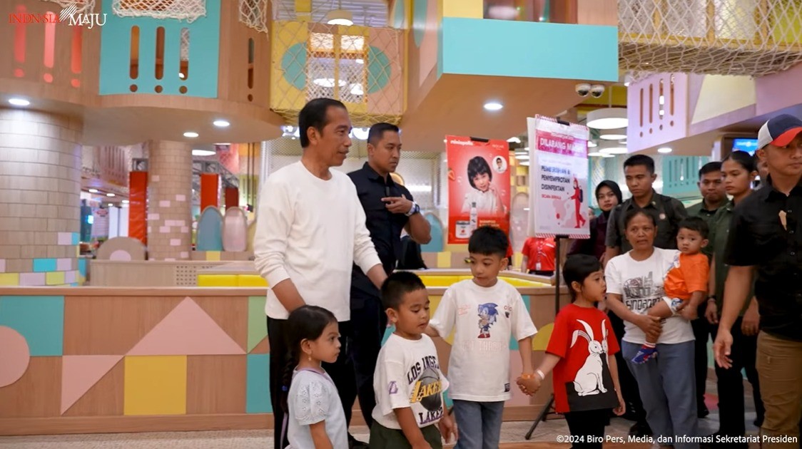 Nusantaratv.com - Setelah menyelesaikan kunjungan kerja ke Sulawesi Selatan dan Sulawesi Utara, Presiden Joko Widodo memilih untuk menikmati waktu bersama dengan keluarganya. Jokowi terlihat bermain dengan lima cucunya di taman bermain salah satu mal di Jakarta pada Sabtu (24/2/2024).