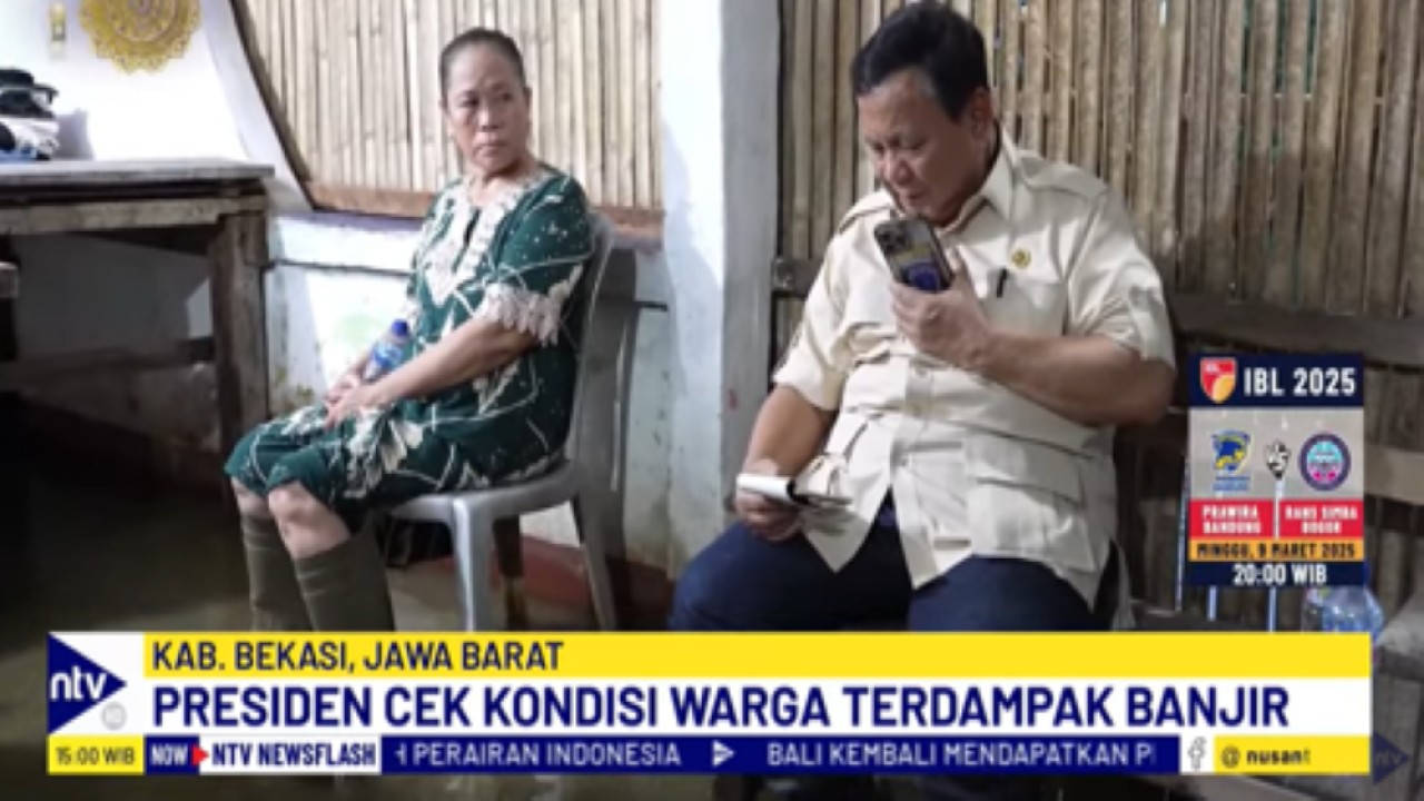 Nusantaratv.com-Presiden Prabowo Subianto mengecek langsung kondisi warga terdampak banjir di Kampung Tambun Inpres, Desa Buni Bakti, Kecamatan Babelan, Kabupaten Bekasi, Sabtu (8/3/2025).