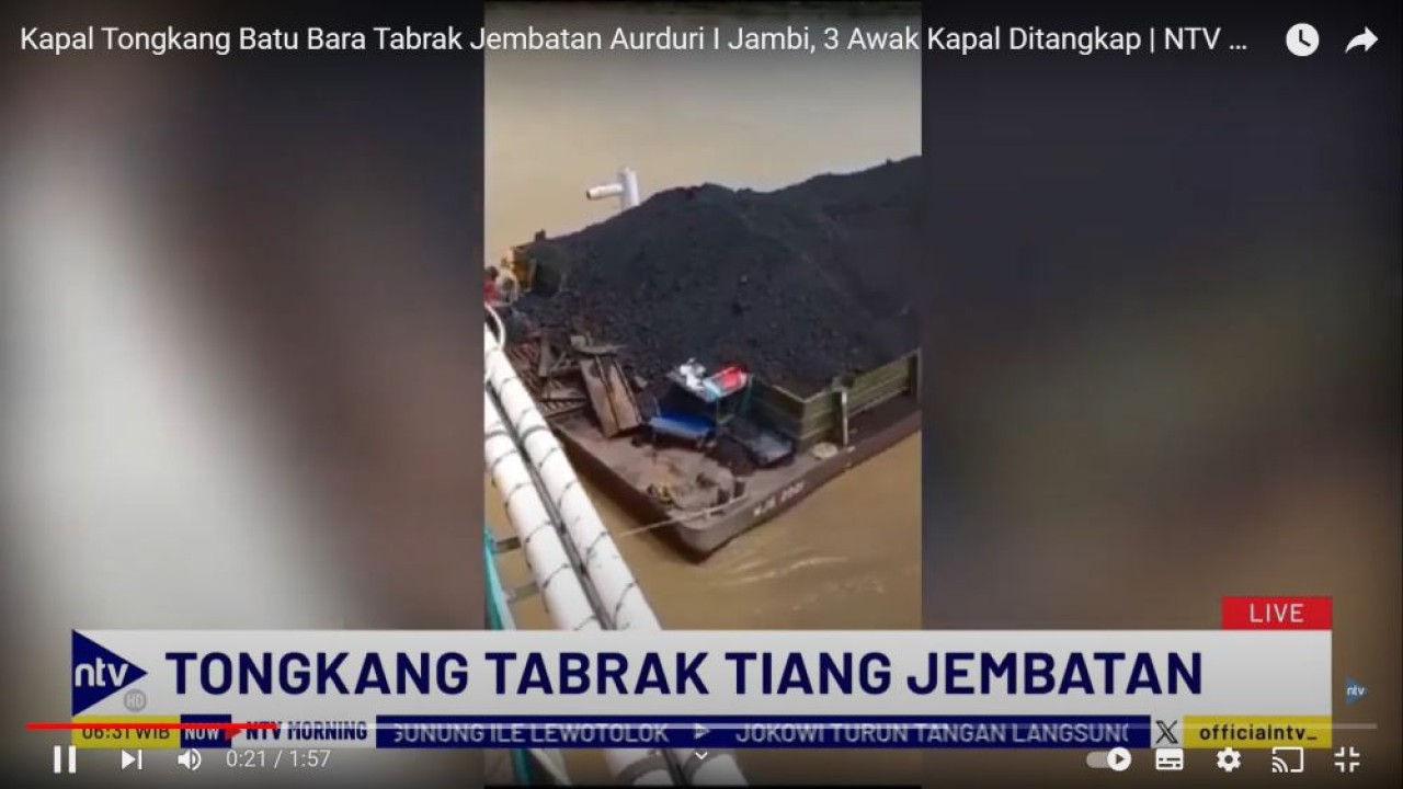 Nusantaratv.com-Kapal tongkang bermuatan batu bara menabrak tiang penyangga jembatan Auduri 1 di Kota Jambi.