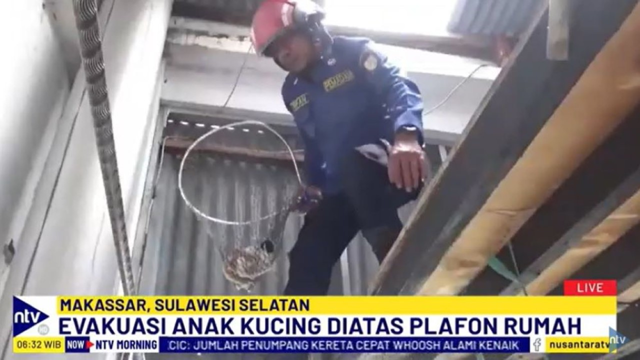 Nusantaratv.com - Tim Rescue Pemadam Kebakaran (Damkar) kota Makassar, Sulawesi Selatan (Sulsel), mengevakuasi empat anak kucing yang berada di atas plafon rumah warga berlantai tiga.