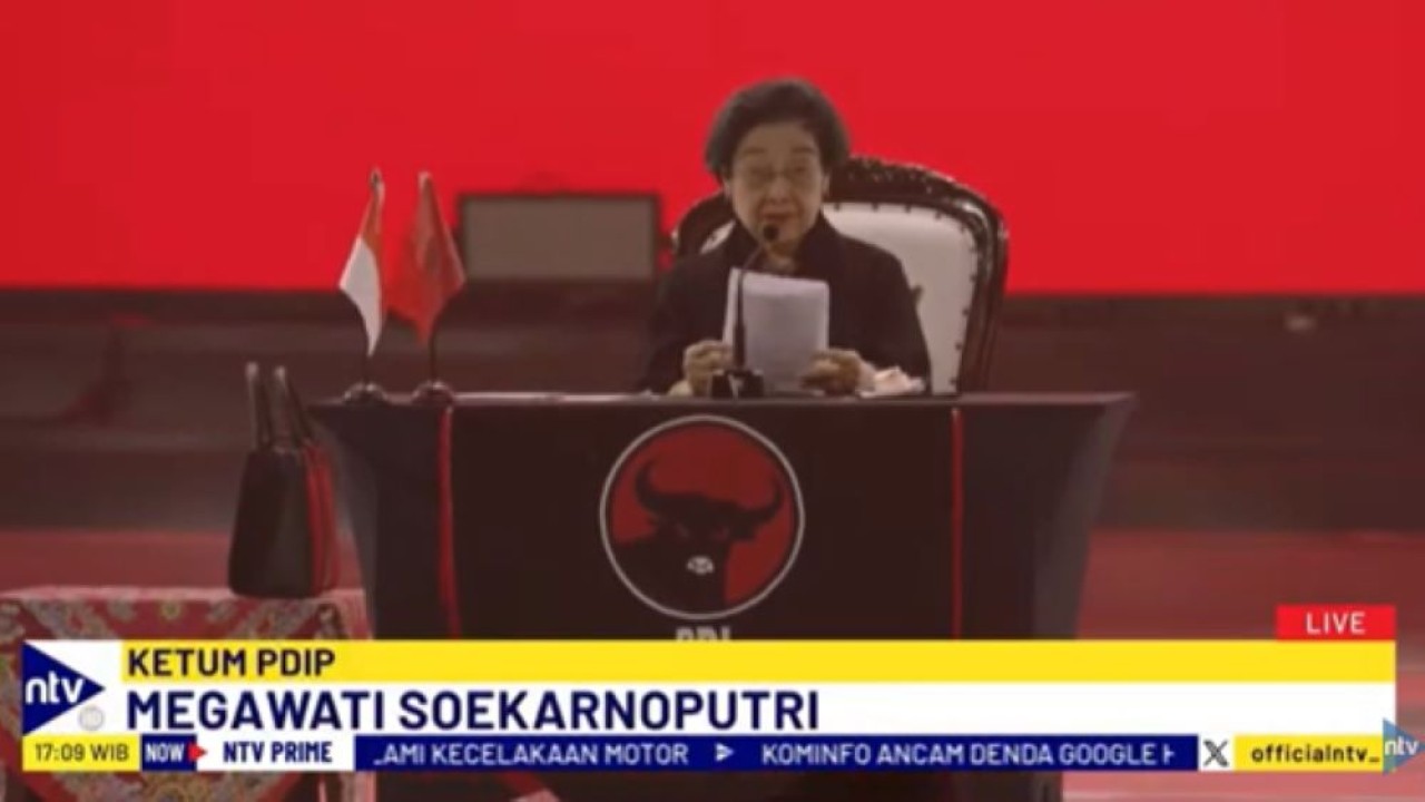 Nusantaratv.com-Ketua Umum PDI Perjuangan, Megawati Soekarnoputri, menyampaikan pidato politiknya dalam Rakernas ke-V PDI Perjuangan di Beach City International Stadium, Ancol, Jakarta Utara, Jumat (24/5/2024) siang.