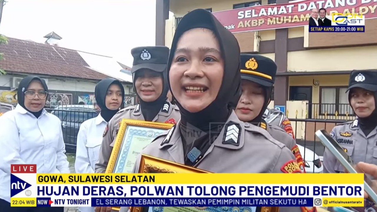 Nusantaratv.com - Aksi heroik ditunjukkan sejumlah Polisi Wanita (Polwan) di Gowa, Sulawesi Selatan (Sulsel), ketika mereka sigap menolong seorang pengemudi becak motor (bentor) yang terjatuh ke selokan saat hujan lebat mengguyur wilayah Sungguminasa, Kecamatan Somba Opu.