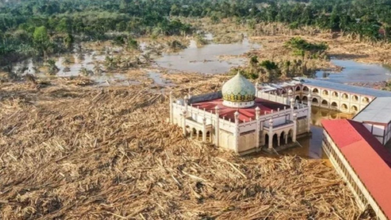 Penampakan lautan batang kayu penuhi sekitar masjid di Aceh Tamiang. (Foto: Antara)