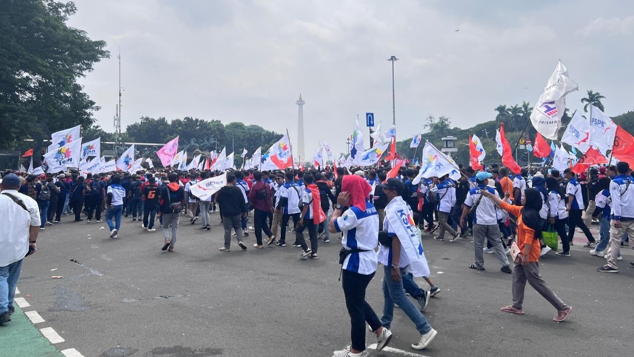 Hingga pukul 10.50 WIB para pekerja masih terus berbondong-bondong ke kawasan Patung Kuda. Bahkan masih ada kelompok buruh yang tertahan di sejumlah lokasi, sebelum masuk ke kawasan Monas.