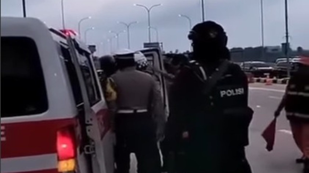 Sang sopir ambulans, seorang pria paruh baya, terlihat pasrah ketika kendaraannya diarahkan petugas ke area Gerbang Tol Bocimi Seksi 2.