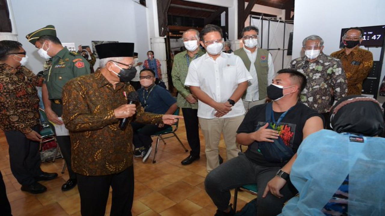 Nusantaratv.com - Wakil Presiden (Wapres) KH Ma'ruf Amin meninjau Sentra Vaksinasi Kompas Gramedia Group di Bentara Budaya Jakarta, Kamis (23/9/2021).