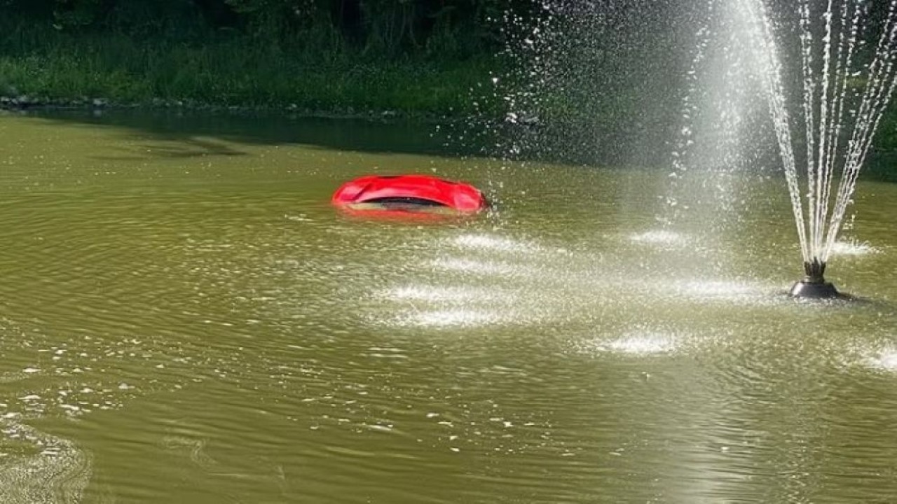 Ferrari 488 GTB tiba-Tiba kehilangan fungsi rem dan jatuh ke kolam di halaman rumahnya. (Foto: Instagram @bigboysstl)