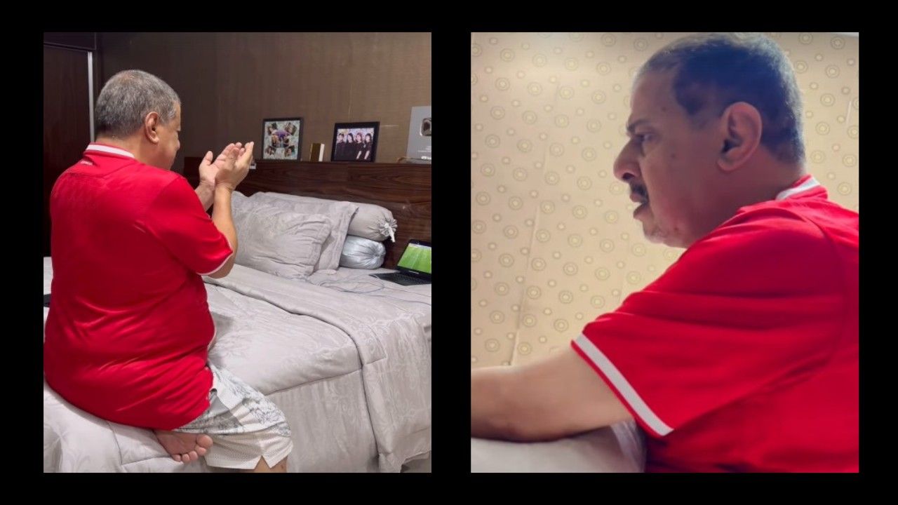 Meskipun awalnya semangat menyaksikan pertandingan dengan mengenakan jersey Indonesia, Pak Muh tidak bisa menyembunyikan kekecewaannya terhadap keputusan wasit.