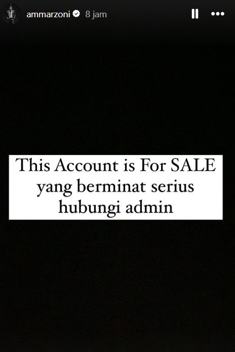 Pengumuman penjualan akun Instagram Ammar ini tersedia dalam unggahan Instagram Storynya, dengan tulisan "This Account is For SALE, yang berminat serius hubungi admin".