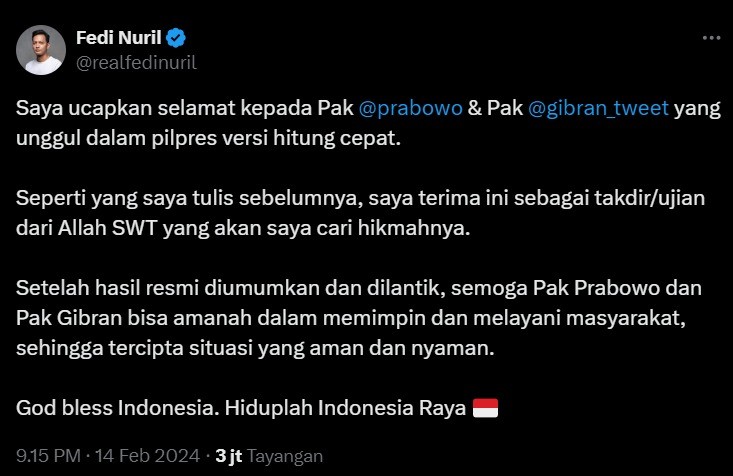 Hal tersebut di lontarkan pada akun Twitter (X) milik pribadinya. Fedi menyatakan menerima hasil hitung cepat Pemilu 2024 yang menempatkan Prabowo-Gibran unggul.