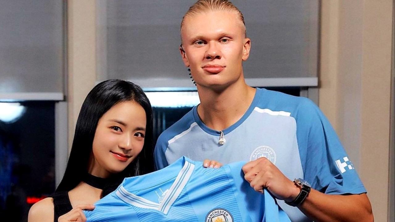 Erling Haaland memanfaatkan tur ke Korea Selatan dengan bertemu bintang papan atas Negeri Gingseng, Jisoo. Keduanya berfoto sembari memegang jersey anyar Man City.