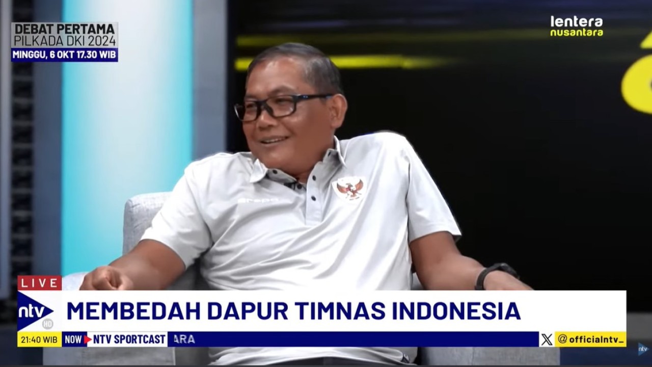Manajer Timnas Indonesia, Sumardji saat hadir sebagai bintang tamu acara Sport Cast di Nusantara TV yang dipandu dua jurnalis senior Ronny Pangemanan (Ropan) dan Boy Noya, Jumat (5/10/2024).