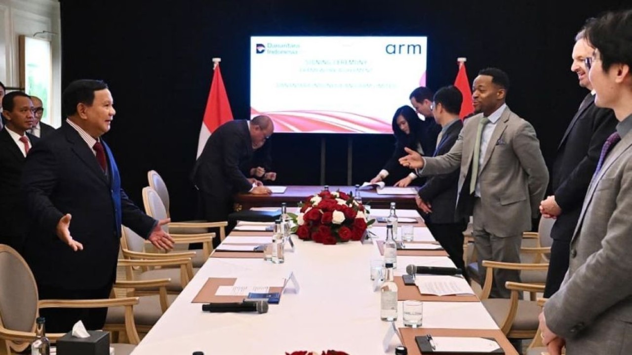 Nusantaratv.com - Presiden Prabowo Subianto menyaksikan penandatanganan perjanjian kerangka kerja antara Badan Pengelola Investasi Danantara Indonesia (BPI Danantara) dan Arm Limited di London, Inggris, pada Senin, 23 Februari 2026.