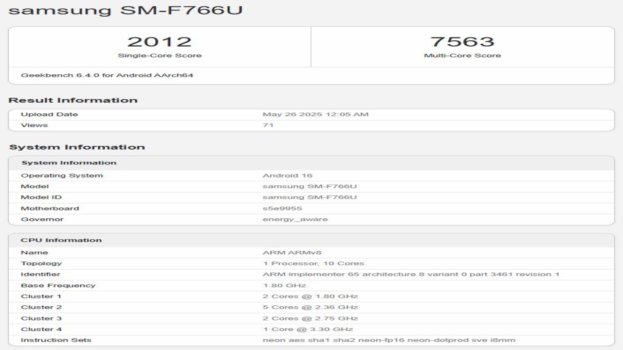 Perangkat Galaxy Z Flip 7 FE dengan nomor model SM-F766U baru-baru ini terlihat di platform benchmark Geekbench, yang mengonfirmasi ponsel ini akan ditenagai chipset Exynos terbaru.